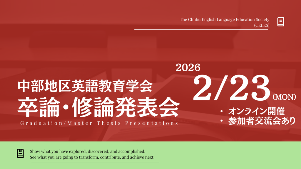 昨年度に引き続き、中部地区英語教育学会では「卒論・修論発表会」を実施いたします。以下をお読みいただき、奮ってご参加ください。 目的 中部地区英語教育学会は、大学所属の研究者はもちろんのこと、小学校・中学校・高等学校で英語 … 続きを読む 卒論・修論発表会 25-26